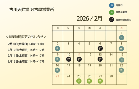 2月のお知らせ 2026.01.28 いつも古川天昇堂をご愛顧いただき、誠にありがとうございます。 2月25日~27日は諸事情により終日休業となります。 ご迷惑をお掛けいたしますが、どうぞよろしくお願いいたします。